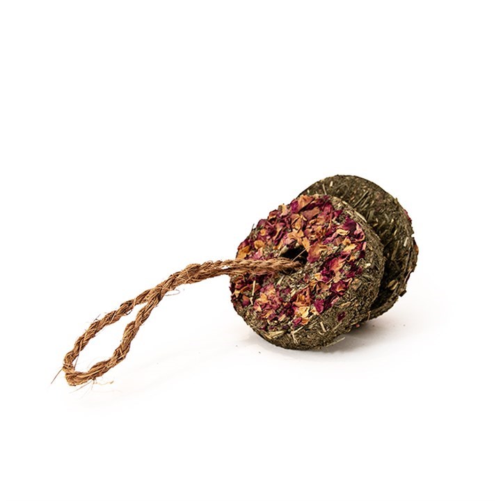 Hanging cookies for rabbits, guinea pigs and other small furries, topped with dried flowers and plants.